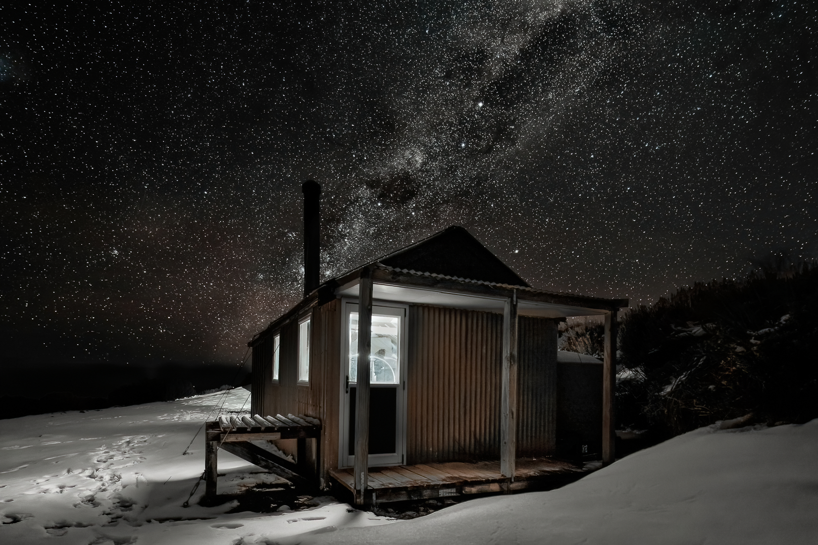 A great image. It creates an emotional response. The white light of the tilly lamp inside the hut illuminates the surrounding snow outside and adds to the feel of the whole image. One wonders what is happening in inside the hut Honours and Best Image of the Month