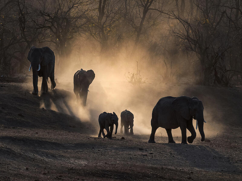 The elephant family are well backlit by the sun. To further enhance this image try a little more exposure, open up the shadows and add some black. This will allow the viewer to see more detail on the animals. Honours