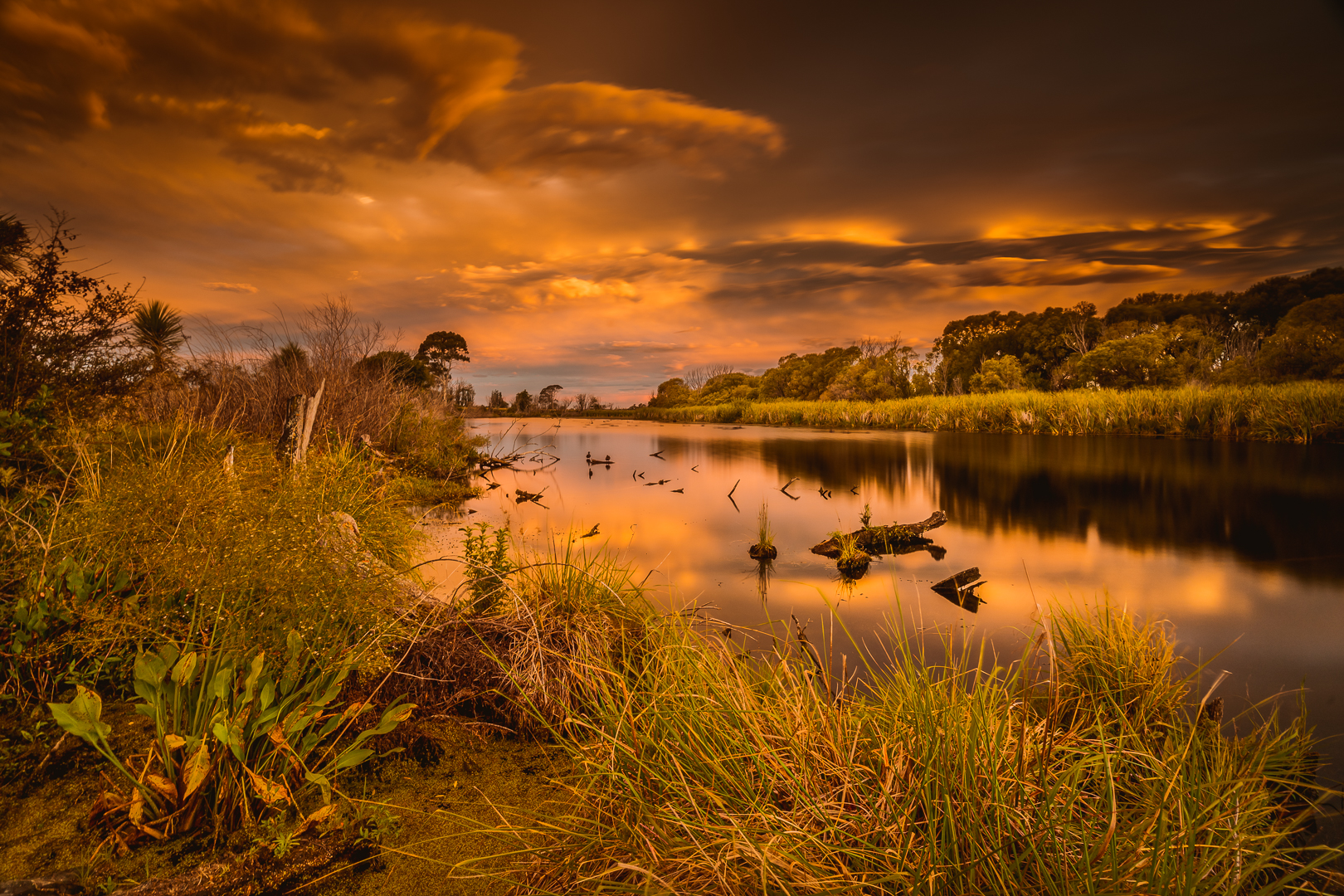 Grovetown Lagoons - Congratulations on getting up early. Well worthwhile to capture the golden hour. (might have been sunset of course!) I like how the lines lead one back to the small patch of blue in the sky. It is quite busy but I am enjoying all the intricacies.