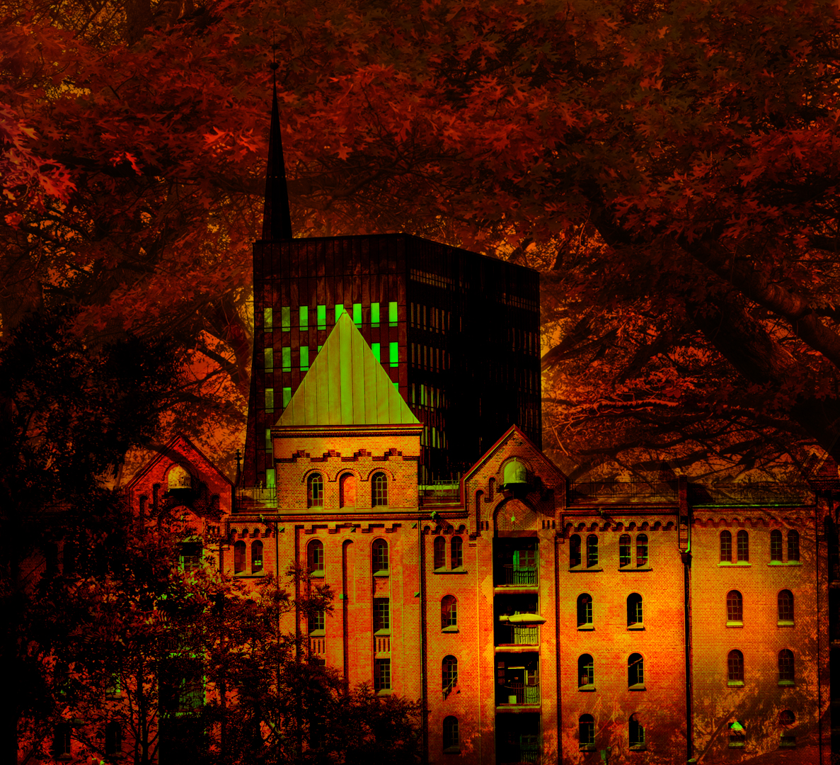 One Evening in Europe an interesting treatment choice... The bright green is rather conflicting with the brick tones however if you like it that’s all that really matters. I do like the fact that the windows are so colourful…maybe a golden colour? /