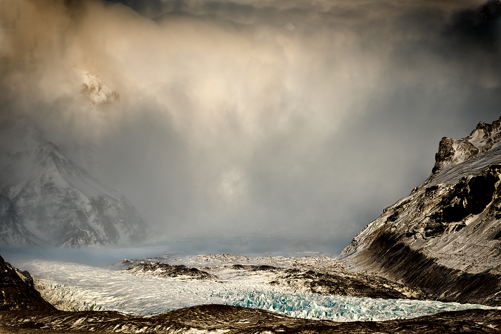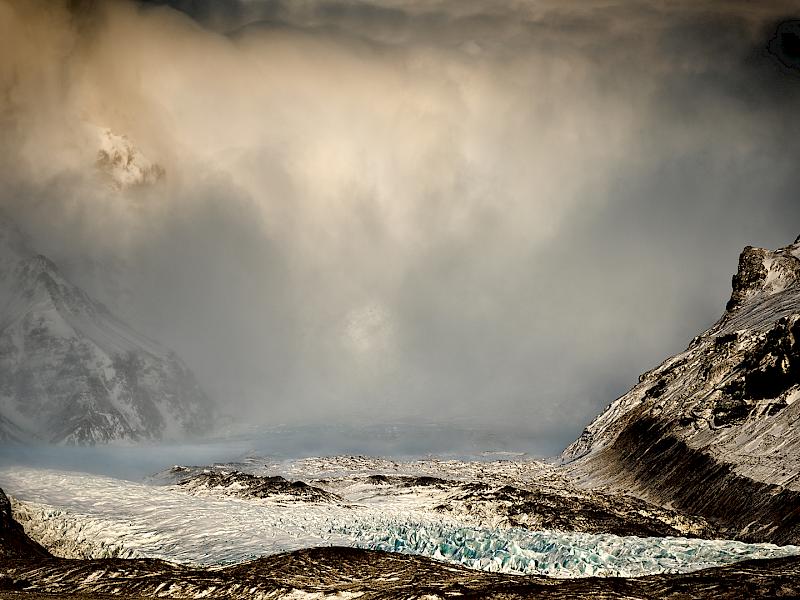 Foreboding - I love the mood you have captured here. The little peak of the mountain above the glacier is a great composition. The light is lovely. A very pleasing landscape.