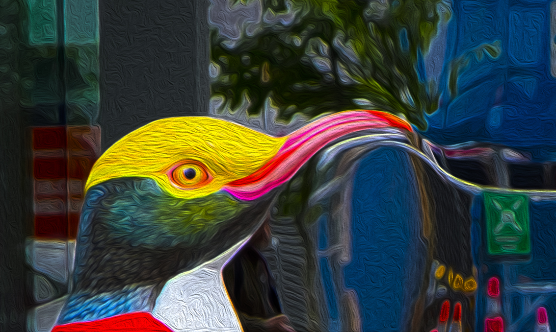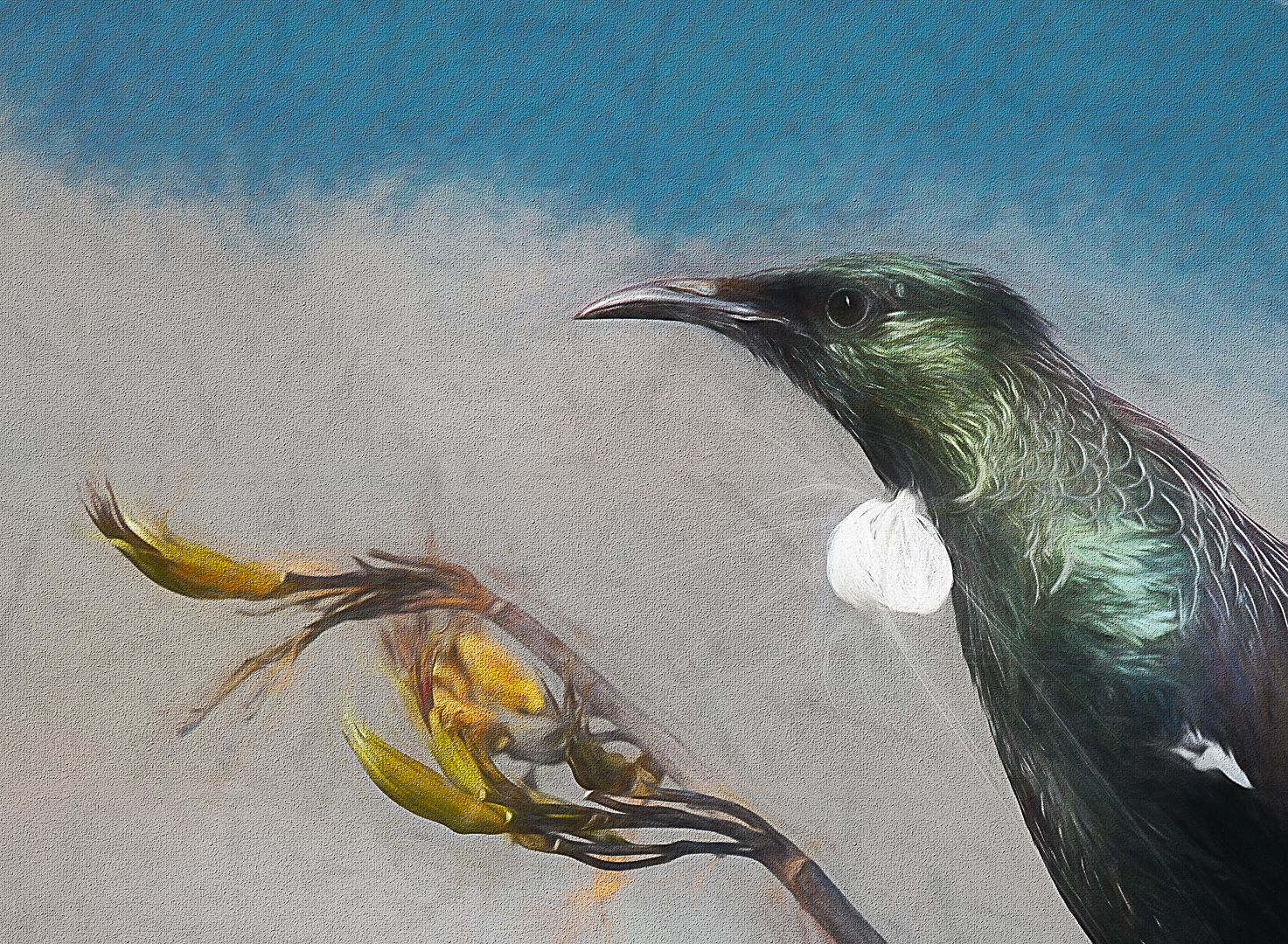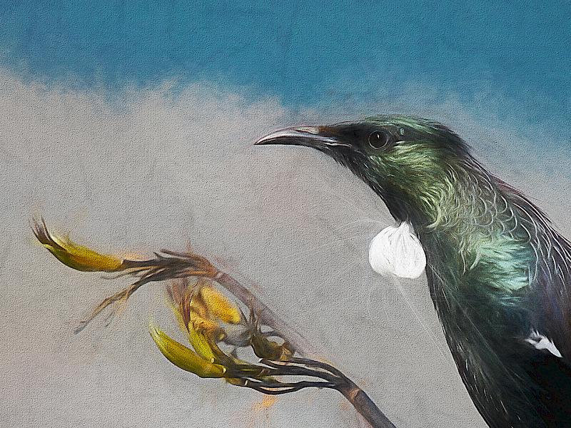 Painted Tui - A fun treatment of the tui and kowhai. I really like the soft tones and then the bright blue sky came along and spoilt it. It dominates the image and takes my eye away from the subtlety of the image.