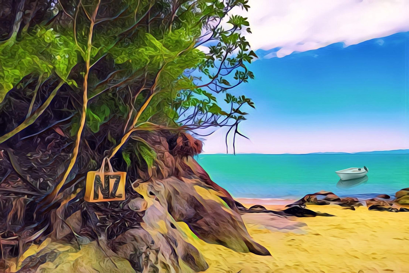 Kaiteriteri - What stunning water colour. My eye is doing a sea saw from the NZ bag to the boat…no real connection and the bag is a distraction for me. The treatment is fun and the original is probably beautiful, if there is an original.