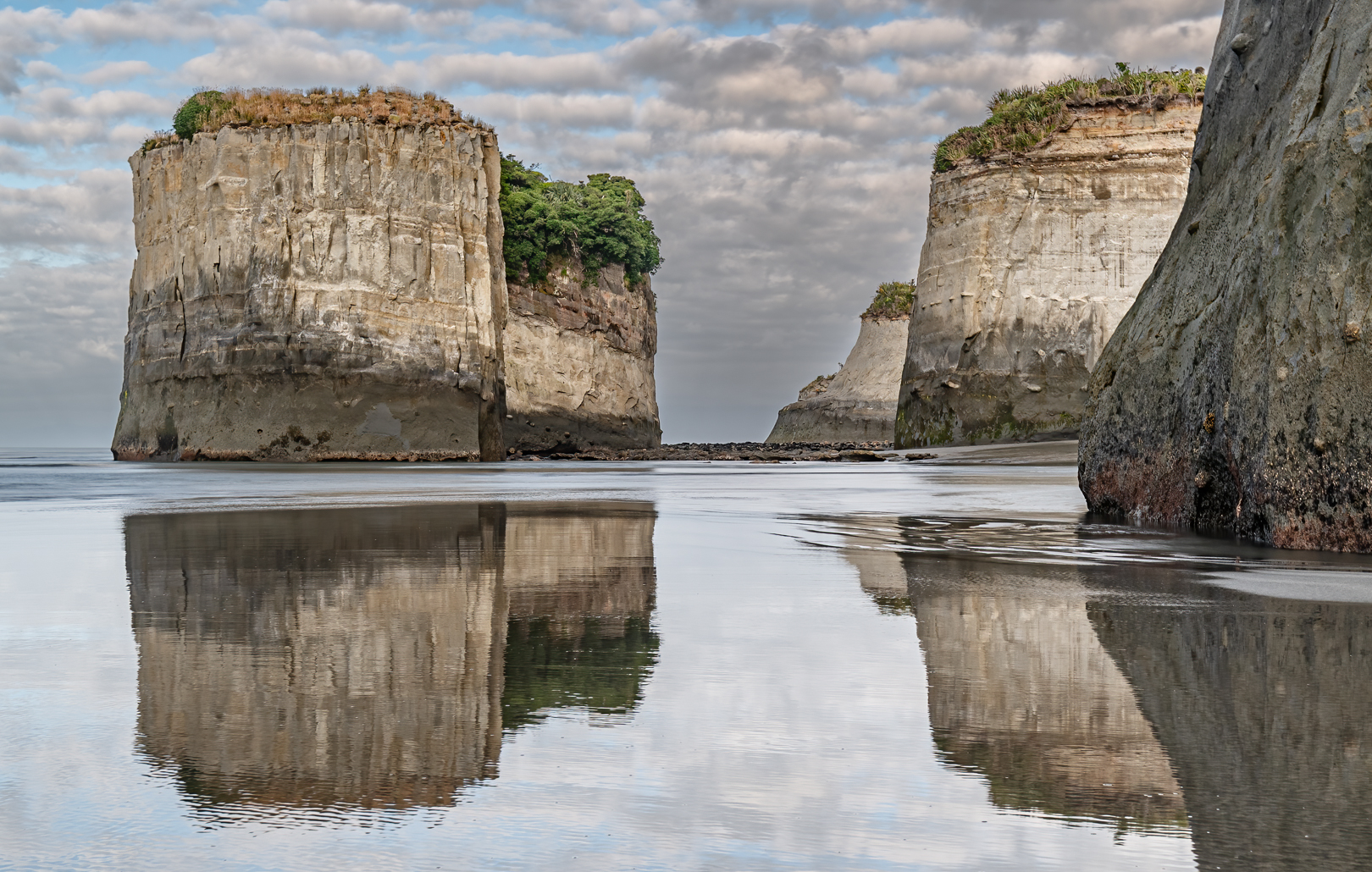 The light is relatively soft, which helps reveal the texture in the sea stacks.