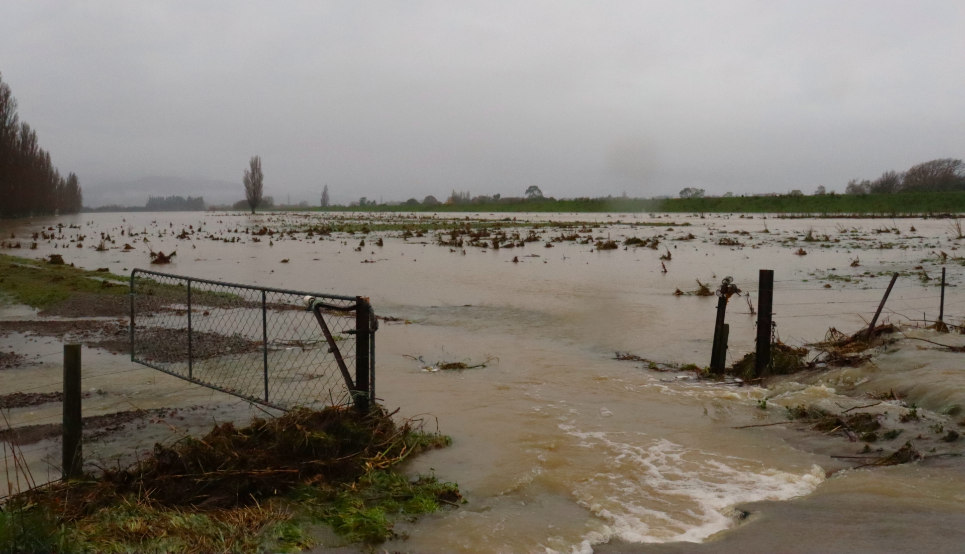 Floodwater rushes through a farm gate |